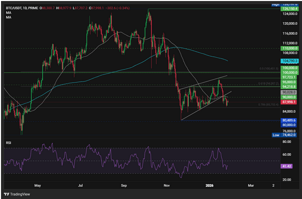 比特币价格稳定在 88,000 美元,此前已从一个月低点 86,000 美元反弹,但尽管美元持续走软,其上涨空间似乎有限。美元走软支撑了美国股指期货温和的风险偏好情绪,但比特币却难以吸引大量资金流入。