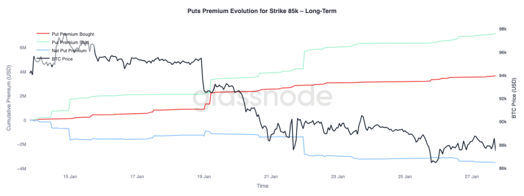 聚焦 8.5 万美元行权价的看跌期权权利金变化,可以发现期限上的分化行为:三个月以内的短期期权,净买入权利金占主导,推动净权利金上升;三个月以上的长期期权,则呈现净卖出权利金。