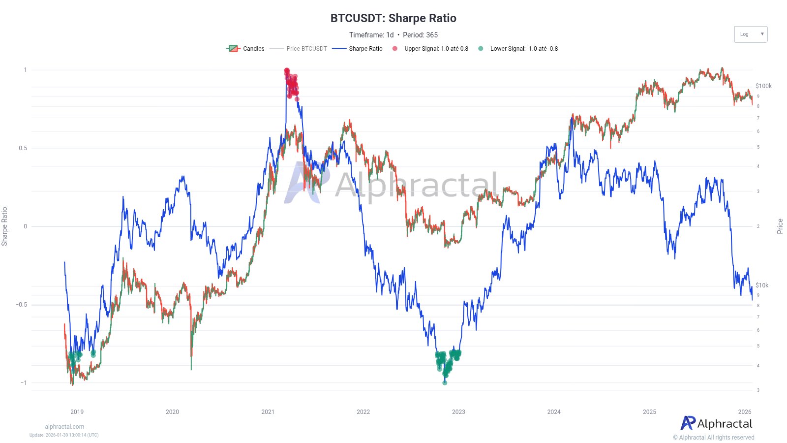 在1月30日发表于X平台的一篇文章中,Alphractal的创始人兼首席执行官Joao Wedson表示:揭晓比特币夏普比率的下降速度超过了比特币价格的下降速度。这里的关键指标是夏普比率,它用于评估特定加密货币(在本例中为比特币)的风险调整后收益。