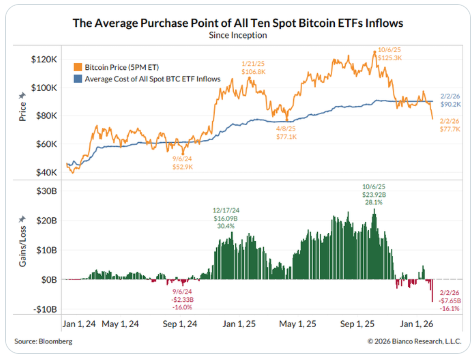 目前的市场结构显示,ETF和MicroStrategy不仅买得多、买得集中,而且目前整体被套。Bianco指出,只要没有新的、可持续的买入叙事出现,资金流出的趋势恐将持续。在这种情况下,一度被视为利好的高位机构化持仓,反而可能转变为市场最大的压力源。比特币目前的问题不在于过去有没有人买,而在于在当前价位下,下一批买家将来自何方。