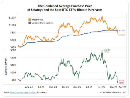 Jim Bianco的分析显示,比特币正在被高度“机构账户化”,这意味着市场首次可以清晰地观测到大资金的持仓成本与盈亏状况。目前,MicroStrategy与11只现货比特币ETF合计持有约10%的比特币流通量,其合并后的平均买入成本约为85360美元。按当前价格计算,这些机构持仓整体浮亏约8000美元/枚,未实现亏损总额高达约70亿美元。