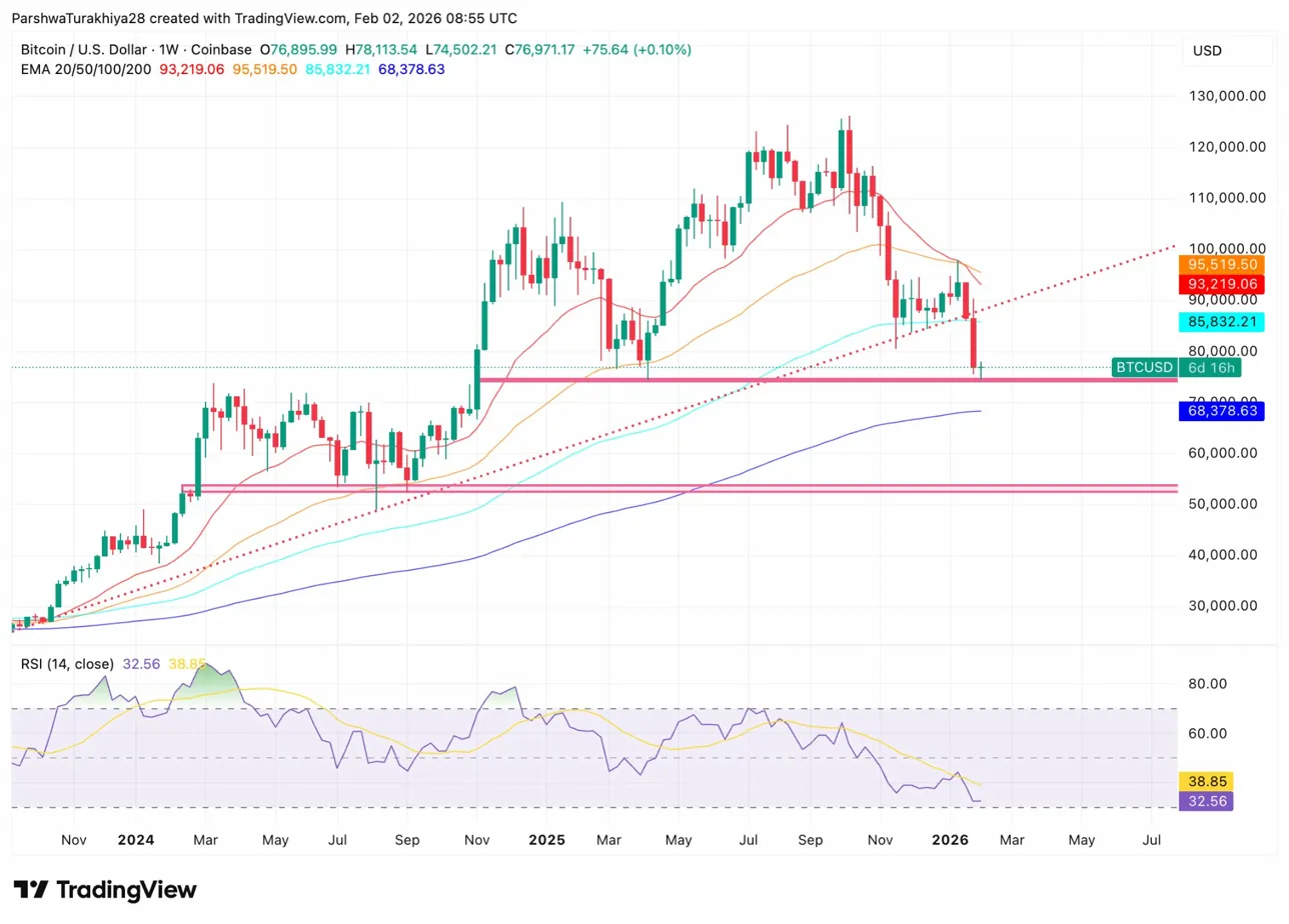 在周线图上,比特币已跌破 20 日均线 93,219 美元和 50 日均线 95,519 美元,目前正在测试关键的 100 周均线 85,832 美元。盘中低点 74,502 美元曾短暂跌破该水平,之后有所回升。