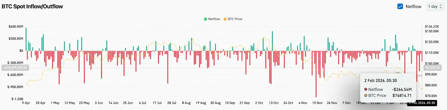 Coinglass数据显示,2月2日现货资金流出高达2.6654亿美元,这是自去年11月调整以来单日最大资金流出之一。如此大规模的抛售反映的是恐慌情绪,而非有序的仓位调整。