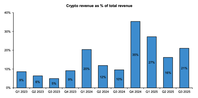 加密货币收入占总收入的百分比。图片来源:Bernstein