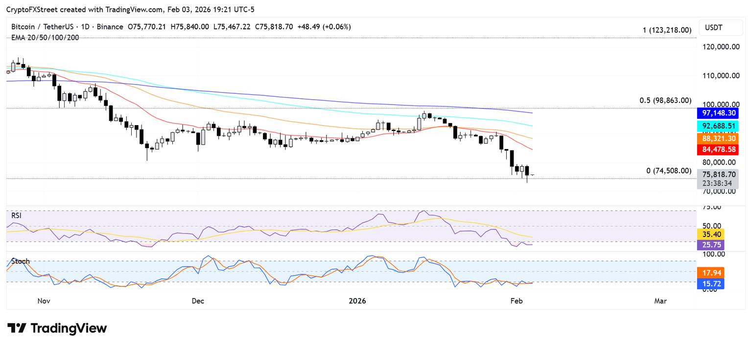 过去24小时内,比特币价格一度下跌超过5%,跌破73,500美元,但截至发稿时已迅速回升至75,000美元上方。过去两周,比特币累计下跌超过23%,市值蒸发约4010亿美元。