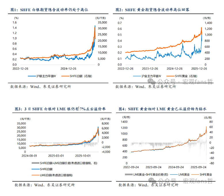 从波动率角度看,白银期货尚未度过流动性风险期。在1月份强势上涨过程中,黄金和白银隐含波动率均快速抬升,并且在本轮下跌过程中,白银期货甚至出现“升波跌停”,2月2日白银期货期权平值隐含波动率达到148%,2月3日白银期货打开跌停板之后,波动率也保持在100%,远远超出2025年平均27%的波动率水平,意味着白银期货虽然打开跌停板,但仍需“降波”完成从情绪到流动性层面的企稳。黄金期货期权波动率同样处于历史偏高水平,截至2月3日收盘,黄金期货平值隐含波动率保持在接近40%的高位,高于2025年全年平均19%的波动率水平。黄金仍需要时间、白银仍需要空间来消解尚未完全消除的流动性风险。