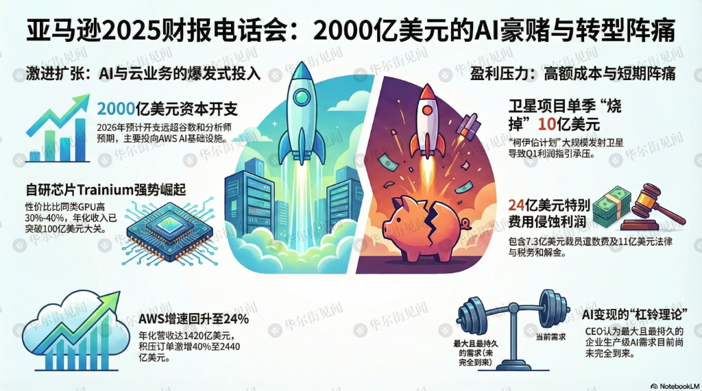 尽管AWS积压订单激增40%至2440亿美元,但市场被亚马逊2026年预计2000亿美元的天量资本开支吓退,股价盘后大跌11%。CFO预警低轨卫星项目将在Q1带来10亿美元额外成本,严重拖累利润指引。...