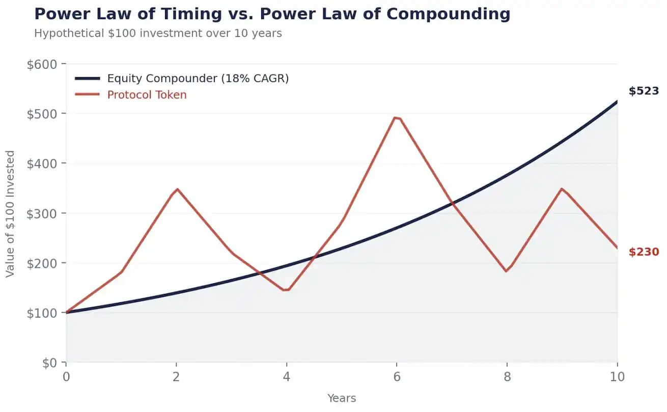 在那之前,聪明的资本会持续流向股票,而代币与股票之间的复利差距,每年都会不断扩大。