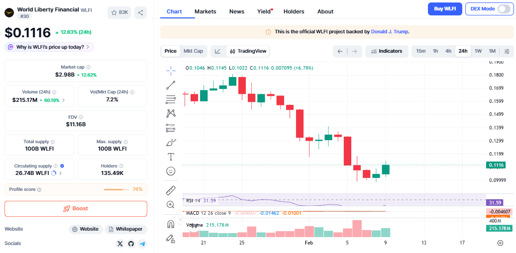 该代币目前交易价格接近 0.111 美元,过去一天上涨约 11%。尽管整体市场波动较大,但该代币仍逆势上涨。许多交易员认为,近期 WLFI 巨鲸的大量买入是此次上涨的重要推手。