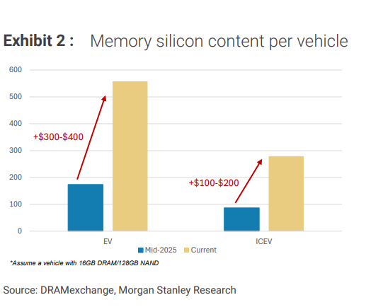 虽然存储芯片仅占汽车销货成本(COGS)的约0.5%,但其价格波动带来的边际影响惊人。摩根士丹利指出,自2025年中期以来,DRAM和NAND的现货价格已出现两位数上涨。