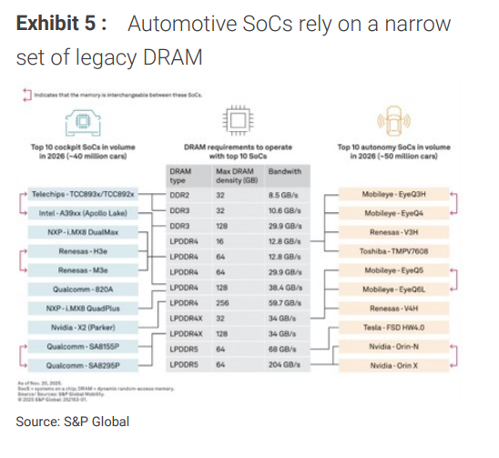 摩根士丹利指出,行业仅剩大约两年的时间向LPDDR5迁移,这需要SoC供应商、一级供应商和整车厂采取协调一致的行动。任何延迟都可能导致“被迫重新设计、发布推迟或在本十年后期生产受限”的风险。此外,最新的市场检查显示,从2026年第四季度开始,汽车客户的DDR5定价将同比翻倍,这进一步加剧了转型的紧迫性与成本压力。