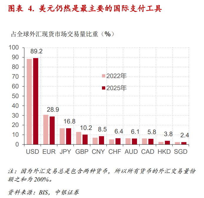 要注音,用本国创造的货币来支付本国的贸易逆差,是美元赋予美国的一种特权,不是其他国家可以模仿的。二战结束的时候,美国拥有全世界最强的经济和军事实力。所以在其主导建立的布雷顿森林体系中,美元自然成为了最主要的国际储备货币和国际支付工具。布雷顿森林体系虽然已经解体了50多年,美元仍然是最主要的国际支付工具。2025年全球外汇现货交易中,包含美元的交易仍然占到了总交易量的接近90%。美元霸权一方面来自美国至今仍然拥有全球最强的综合国力,另一方面来自国际经贸活动中的路径依赖。