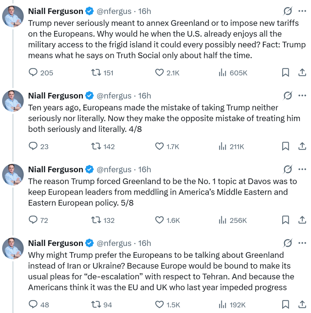 知名历史学家尼尔·弗格森1月24日在社交媒体X上发表最新观点,特朗普近期在达沃斯论坛上高调炒作“购买格陵兰岛”议题,实则是一场精心策划的战略佯攻。