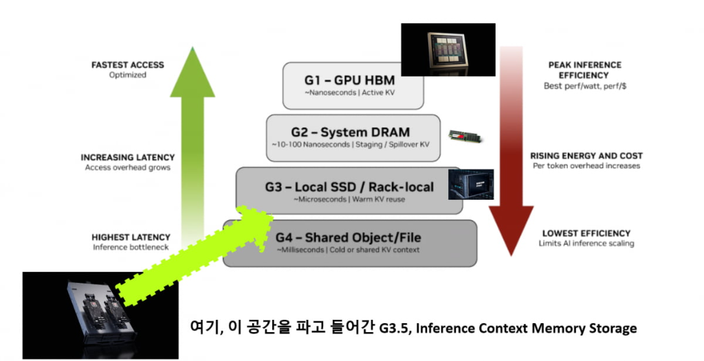 随着AI从单纯的学习转向推理,以及应用场景向多模态扩展,所需处理的数据量呈现不规则且爆炸式的增长。英伟达发现,仅靠昂贵的HBM或常规DRAM已无法容纳海量的KV缓存,而现有的服务器内部存储架构在应对未来推理时代时显得捉襟见肘。因此,一种能承载海量数据且保持高效访问的专用存储平台成为刚需。
