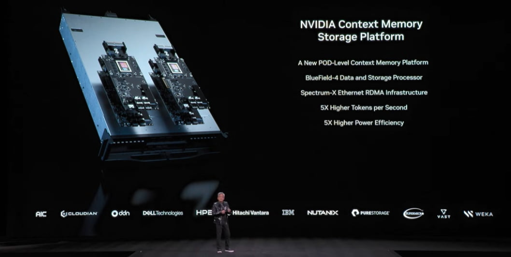 NVIDIA CEO 黄仁勋在 CES 2026 上推出 ICMS。图片由 NVIDIA YouTube 提供。DPU 超大容量 SSD = KV 缓存存储专用团队