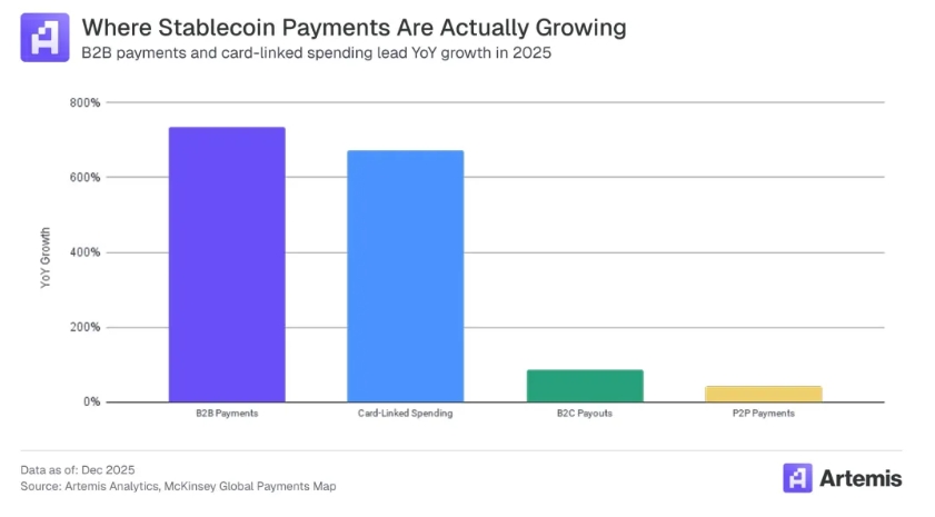 (Big Ideas 2026:区块链在未来趋势中的定位) 然而,这些交易活动大多并非真正的终端用户支付,例如向供应商付款或汇款。它们主要包括交易、内部资金转移和自动化区块链活动。 为了排除干扰因素,更准确地评估稳定币支付量,麦肯锡与领先的区块链分析提供商 Artemis Analytics 合作。分析结果表明: 按目前的交易速度计算(年化数字基于 2025 年 12 月的稳定币支付活动),每年实际的稳定币支付量约为 3900 亿美元,约占全球支付总量的 0.02%。 这凸显了对区块链上记录的数据进行更细致解读的必要性,以及金融机构需要进行以应用场景为导向的战略性投资,才能实现稳定币的长期潜力。