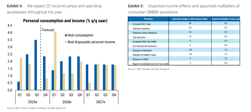 模型预测: 摩根士丹利预计该法案仅能将今年的实际消费提振20个基点(对GDP的整体影响约为40个基点)。