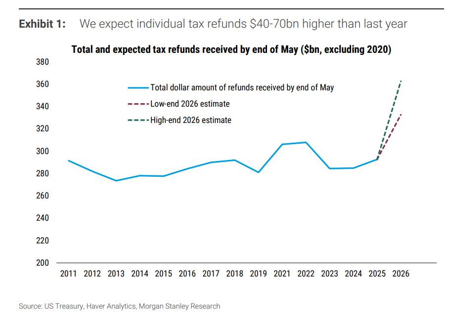 - 关键数据: 摩根士丹利预计,今年的个人退税额将比去年高出400亿至700亿美元。如果收到退税的消费者数量保持不变,平均退税规模将增加550美元,达到约3500美元的历史高位。