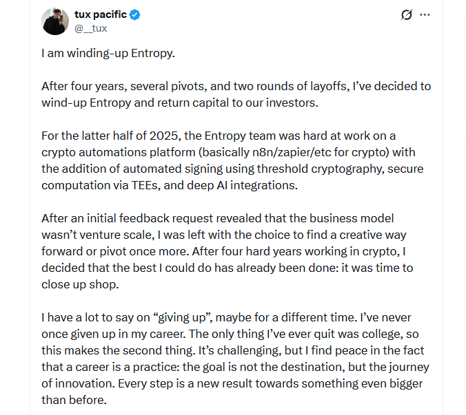 Entropy创始人兼首席执行官Tux Pacific周六在X平台发文称,经过多年的运营,这一加密自动化平台已不具备可行的发展路径。