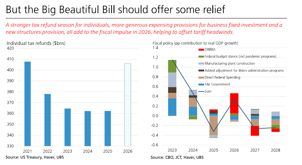 在私人部门需求疲软的背景下,财政政策再次成为短期救生圈。瑞银预计,随着大美丽法案("One Big Beautiful Bill Act"(OBBBA))法案的实施,2026年第二季度将迎来巨大的个人退税潮,预计退税规模将增加约500亿至600亿美元。