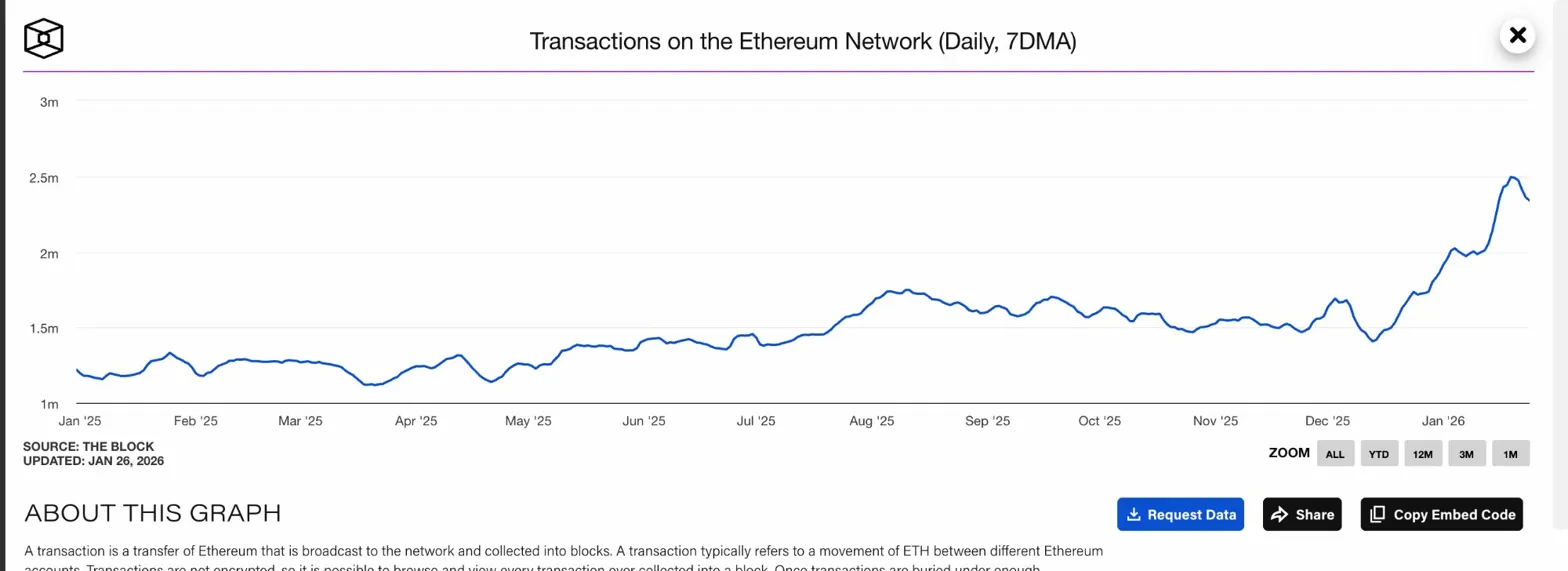 链上数据显示,交易量与价格存在根本性脱节。据The Block报道,以太坊7日移动平均日交易量在1月24日达到234万笔,创下该网络历史最高水平之一。