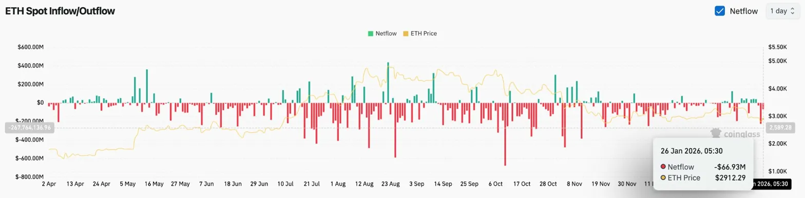 交易所资金流动数据证实了基本面看涨的观点。Coinglass 数据显示,1月26日净流出资金达6693万美元,这意味着加密货币正以惊人的速度从交易所流入私人钱包。