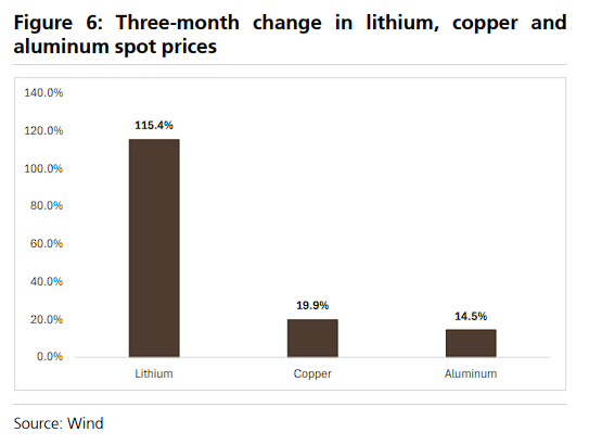 - 纯电动车(BEV,80kWh电池): 锂成本增加约人民币3800元。