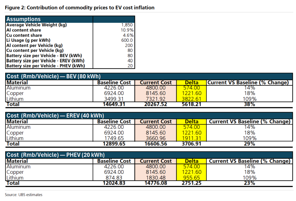 瑞银表示,综合计算,仅金属原材料一项,纯电动车(BEV)的单车成本通胀就高达 人民币5600元(其中锂贡献了大部分涨幅,高达109%的价格反弹)。
