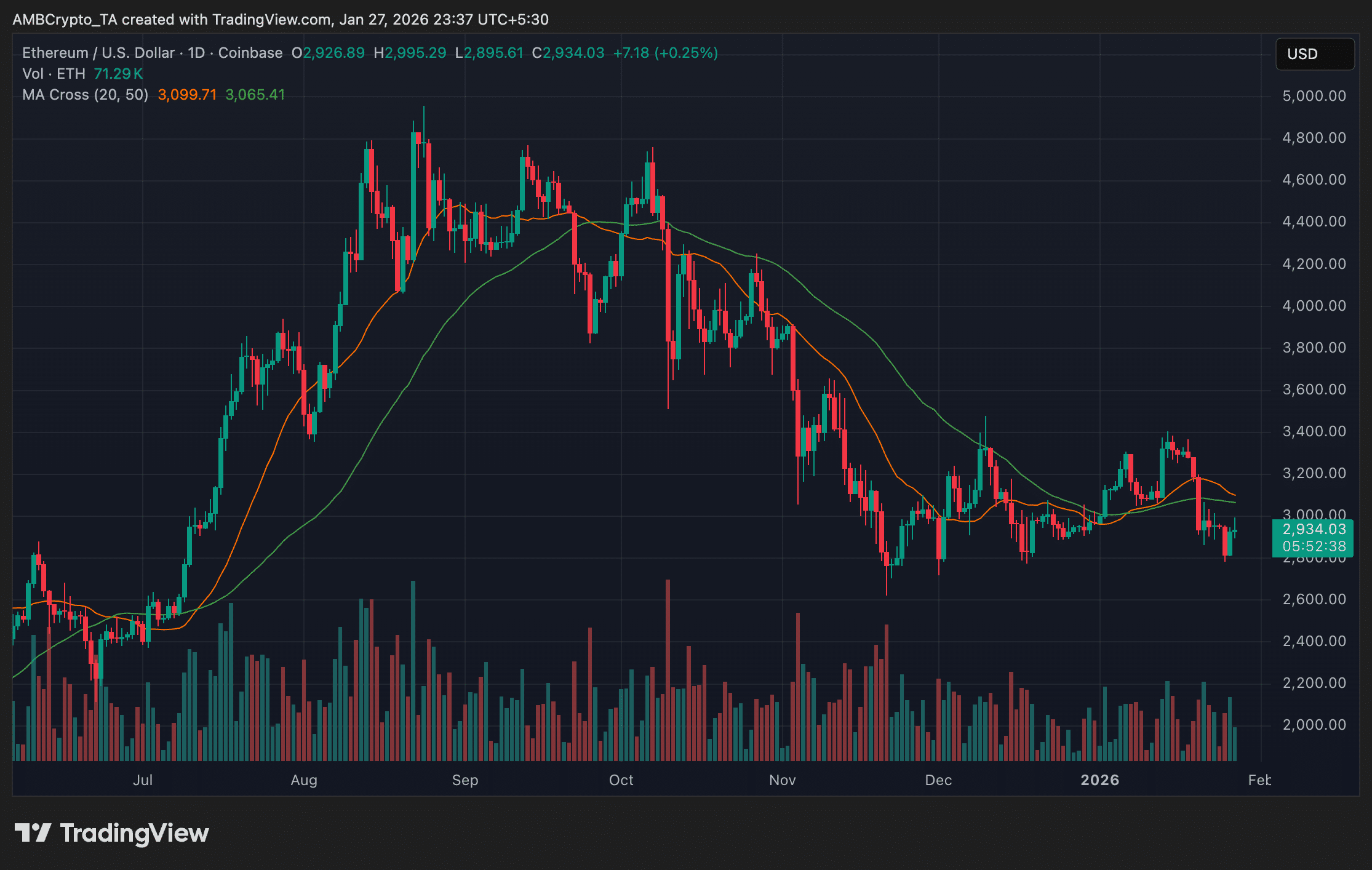 以太坊交易量大约2,930 美元 – 2,950 美元截至撰稿时,该股仍低于其 50 日和 200 日移动平均线,这两条平均线目前接近低点。3000美元地区。