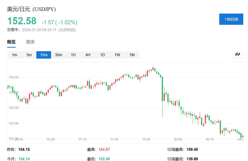 日元成为美元走软的另一推手。上周五传出日本政府将要干预、甚至可能和美国政府联合干预汇市支撑日元的消息后,日元连续第三个交易日上涨。美元兑日元在周二美股午盘跌至152.60下方逼近152.50,日内跌幅扩大到1%以上,刷新2025年10月末以来低位。