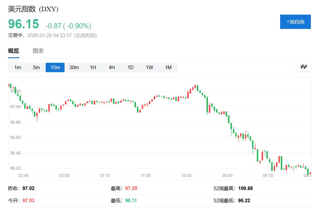 美元疲软反映出投资者在华盛顿政策走向难以预测背景下的谨慎情绪,其中包括特朗普威胁接管格陵兰。据彭博报道,投资者正为美元进一步走弱寻求对冲,短期期权的溢价已升至2011年彭博开始编制该数据以来的最高水平。