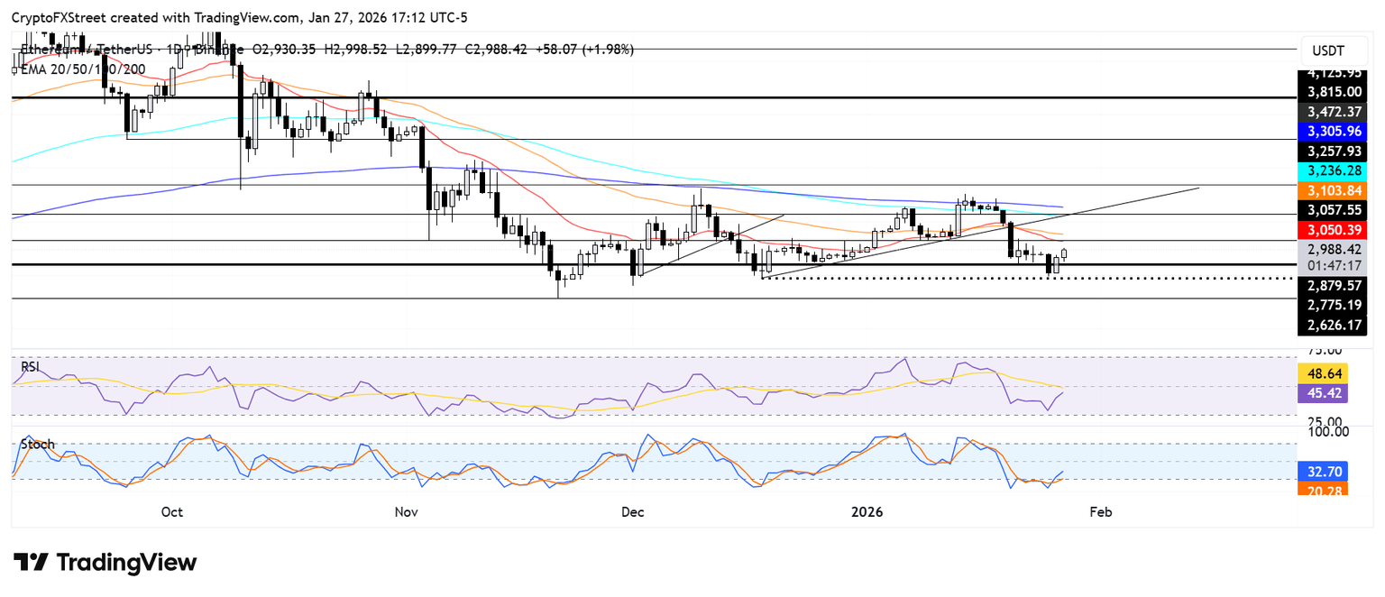 ETH 在恢复 2,880 美元的支撑位后,在 3,000 美元的心理关口附近面临阻力,该关口略低于 20 日指数移动平均线 (EMA) 和 3,057 美元的水平。