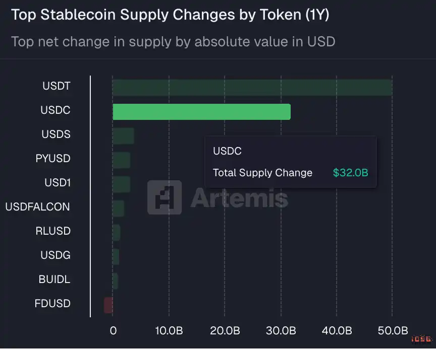虽然 Tether 可能仍将在离岸与新兴市场中维持主导地位,但过去一年,Circle 的 USDC 净供应量也是增加了 320 亿美元,仅此于 USDT 的 500 亿美元。