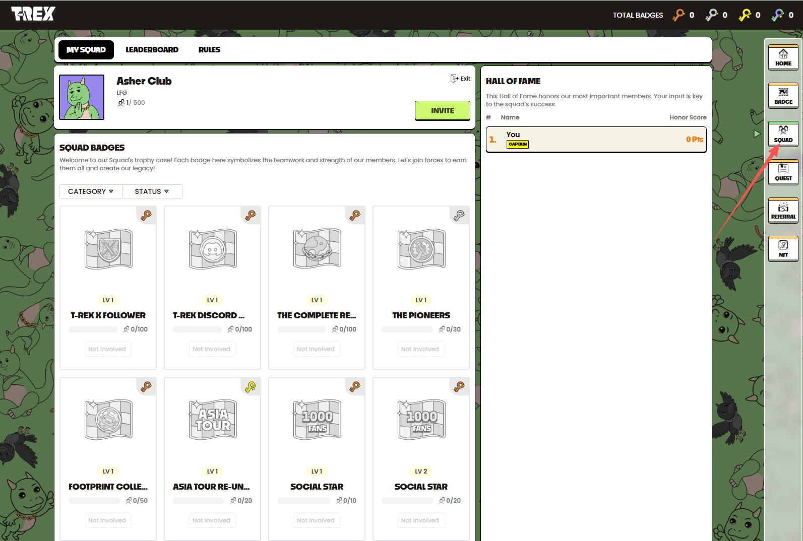 STEP 3. 点击右侧的“SQUAD”,选择一个战队加入,也可以加入我的战队,邀请链接:s.trex.xyz/ll1g9K。