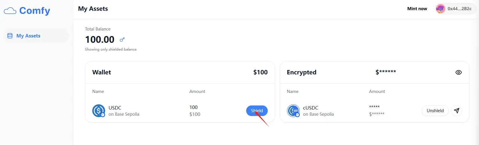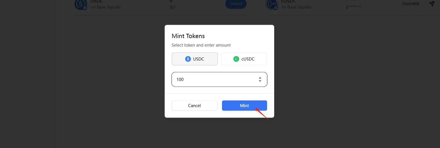 STEP 4. 选择“Shield”将一部分 USDC 兑换成 cUSDC,再点击“Unshield”将部分 cUSDC 兑换为 USDC。
