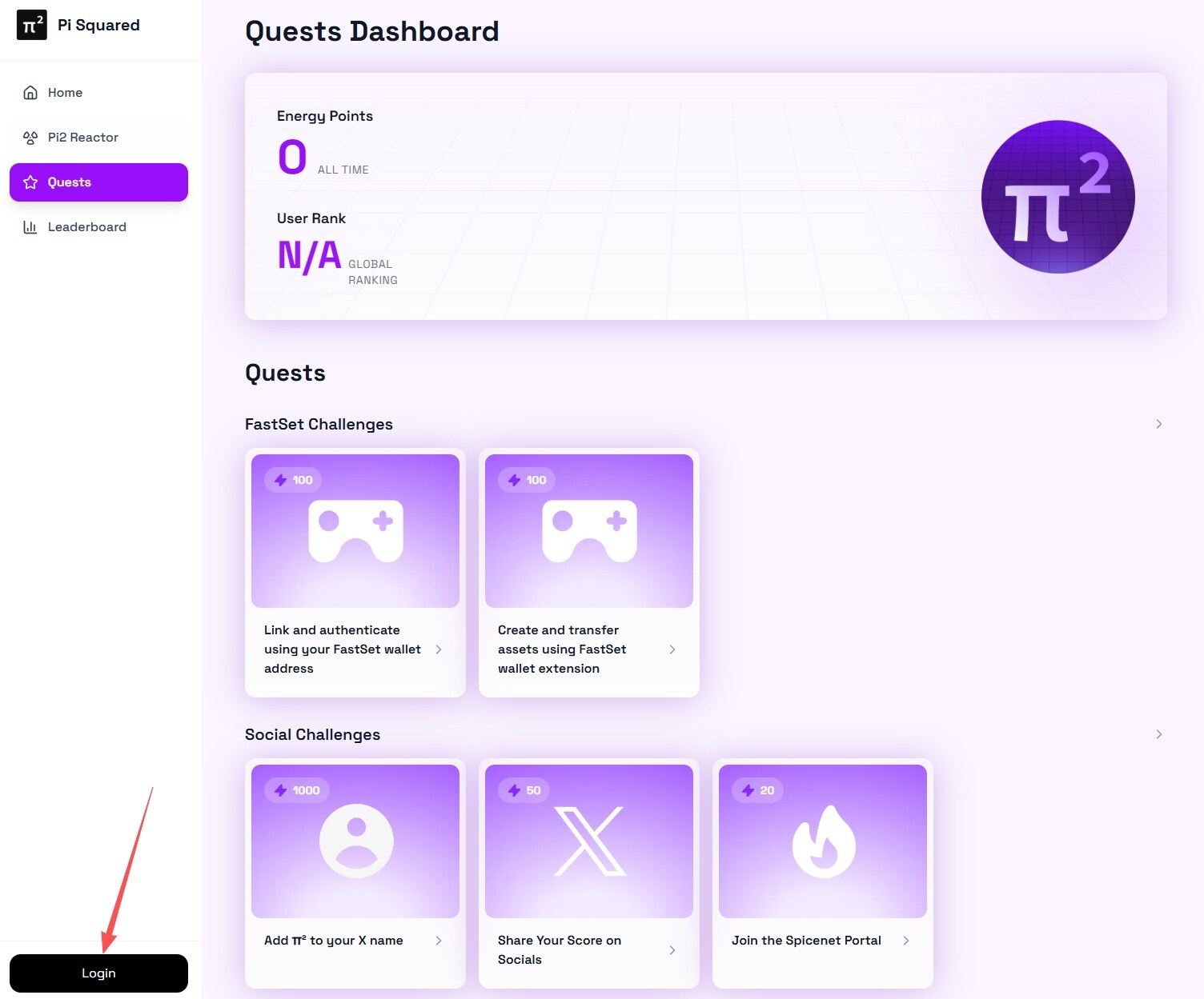 STEP 2. 进入交互网站(链接:https://portal.pi2.network/quests),在 Pi Squared 页面左下角点击用户登录,通过谷歌邮箱进行登录后绑定 X 账户、Discord、钱包。
