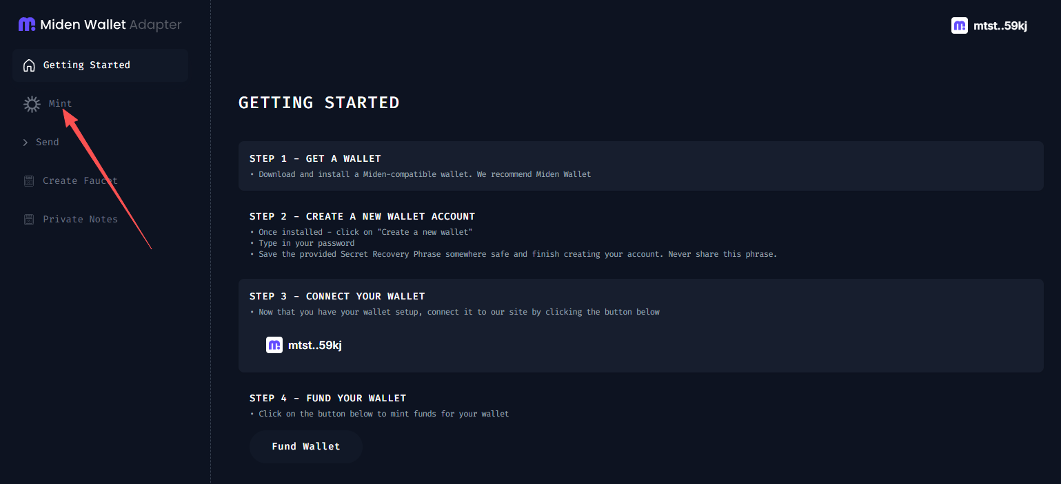 STEP 2. 进入交互网站(链接:https://miden.leo.app/),通过 Miden Wallet 插件连接刚注册好的地址,并点击左侧栏目中的“Mint”,领取 100 枚测试币。