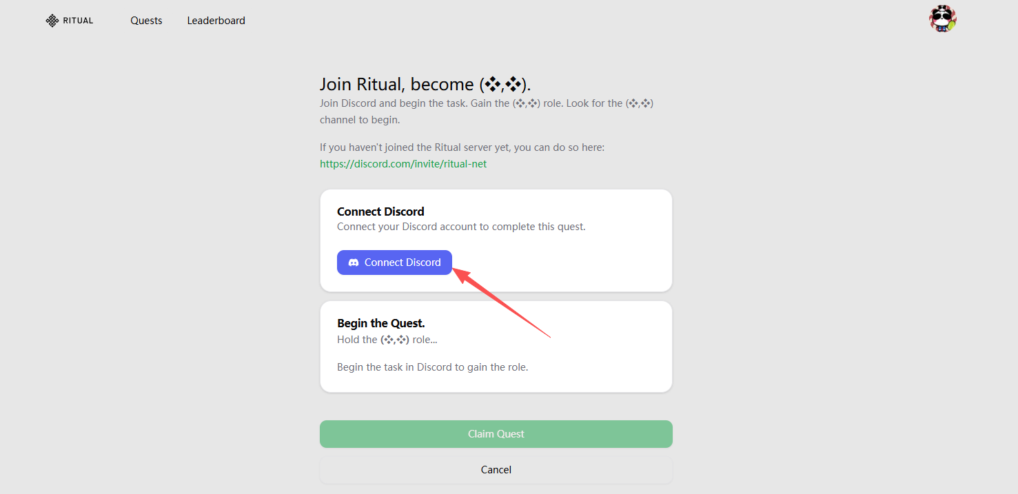 STEP 1. 进入交互网站(链接:https://ritual-synful.domino.page/quests),点击右上方的 Login,通过 X 账号进行登录。