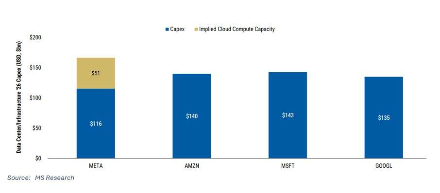 亚马逊的资本开支最为不透明,因其未拆分AWS基础设施与零售业务。摩根士丹利预计2026年基础设施资本开支为1400亿美元,总资本开支为1750亿美元,而2025年指引为1250亿美元。