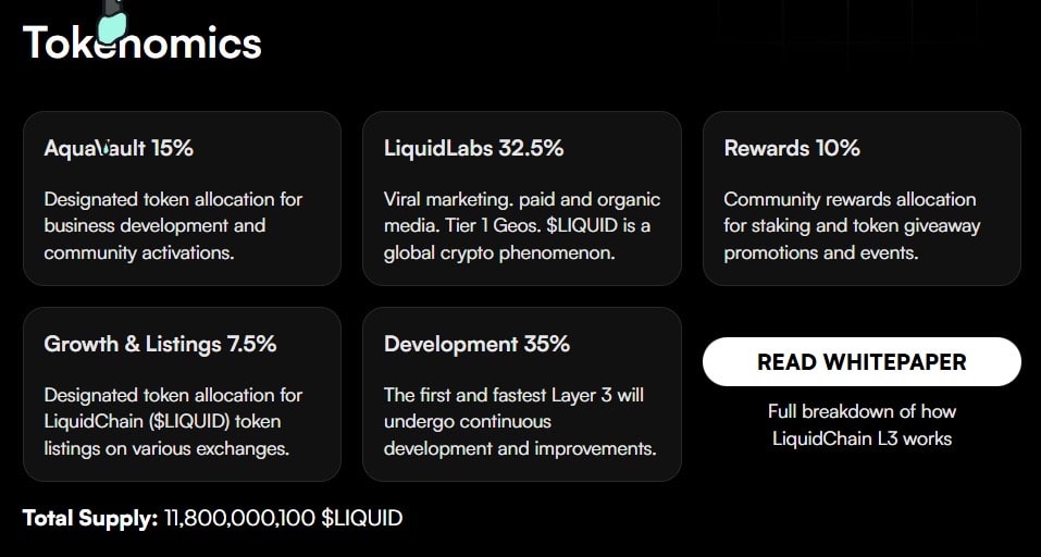 代币经济模型分配合理。总供应量的35%用于研发,以支持LiquidChain Layer-3基础设施的持续升级。32.5%分配给LiquidLabs,用于全球营销、生态系统拓展和市场推广。
