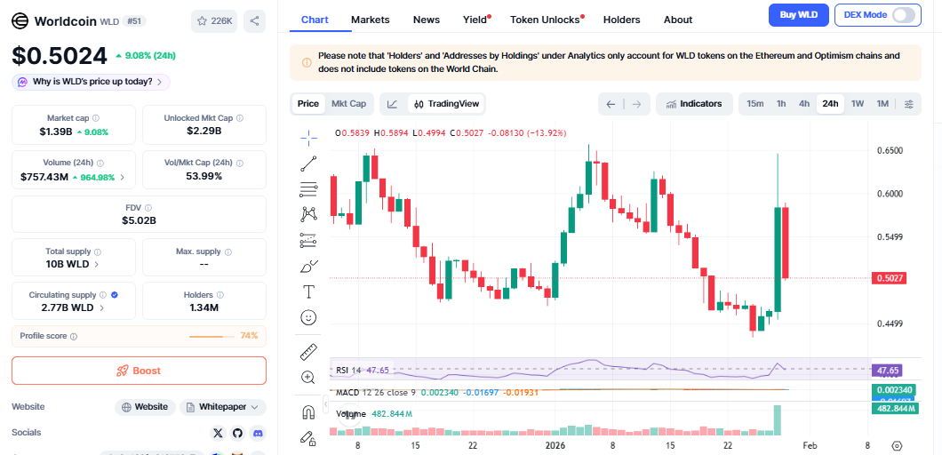 在过去24小时内,Worldcoin价格飙升近10%,即便其他加密货币市场整体略有下跌。这一突如其来的涨势令许多交易者感到意外。目前,WLD的交易价格接近0.50美元,表明市场买盘强劲。