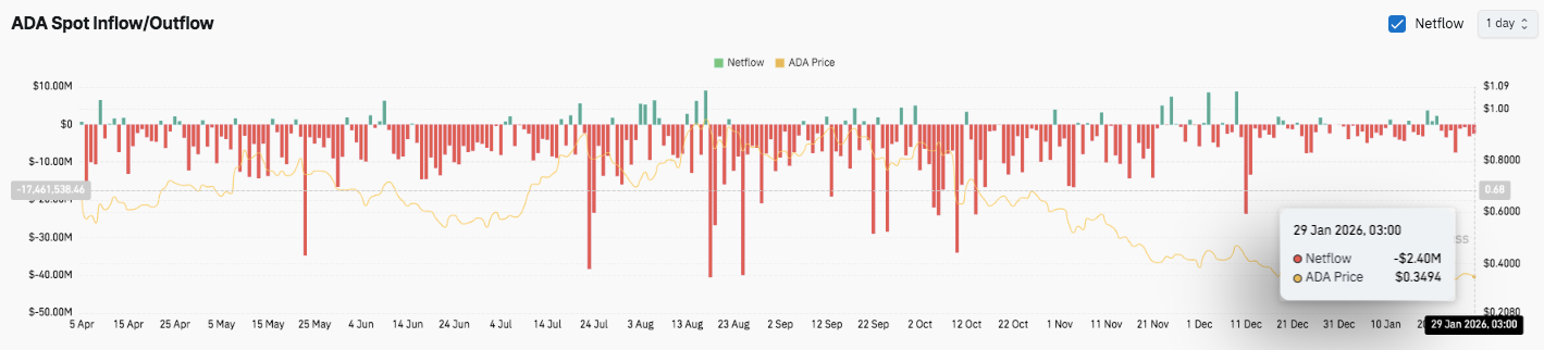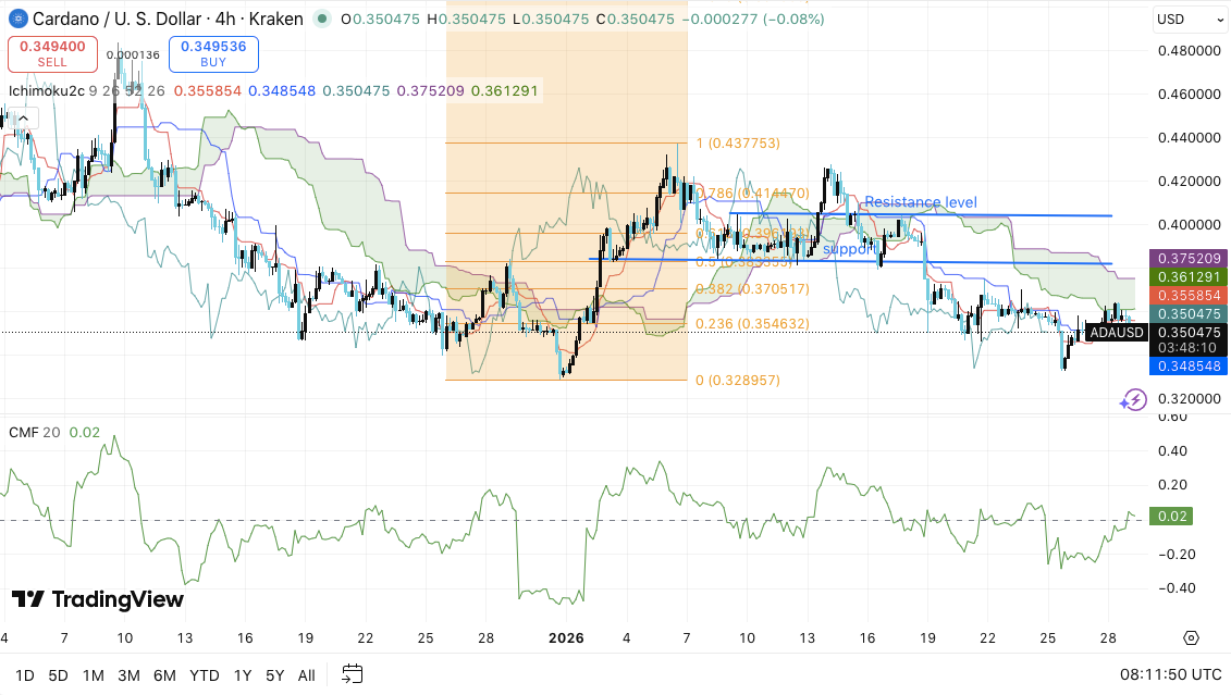 在4小时图上,Cardano仍处于看跌结构中,其特征是高点不断降低且反弹力度有限。价格维持在Ichimoku云图和基准线下方,进一步强化了下行倾向。