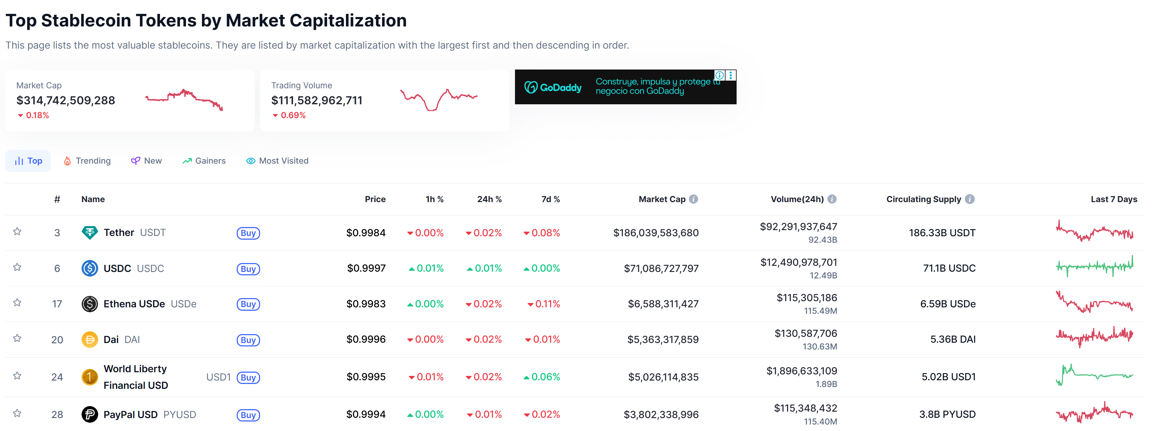 按市值计算的主要稳定币。来源:CoinMarketCap