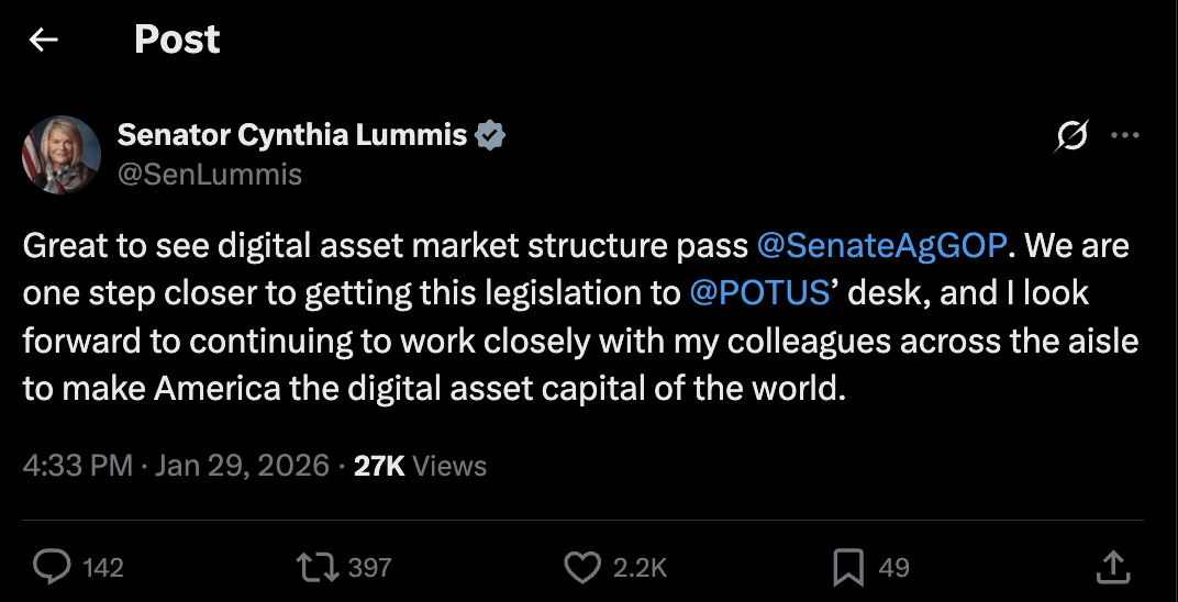 尽管委员会批准虽然不能保证参议院会通过该法案,但它消除了一个关键瓶颈,该瓶颈阻碍了国会此前改革加密货币市场结构的努力。