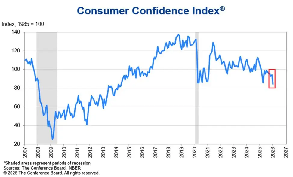 1月份消费者信心指数下降9.7点至84.5,连续第六个月下滑,创下2014年5月以来的最低水平。该指数目前已正式低于2020年疫情冲击期间的水平,凸显了消费者信心的严重恶化。