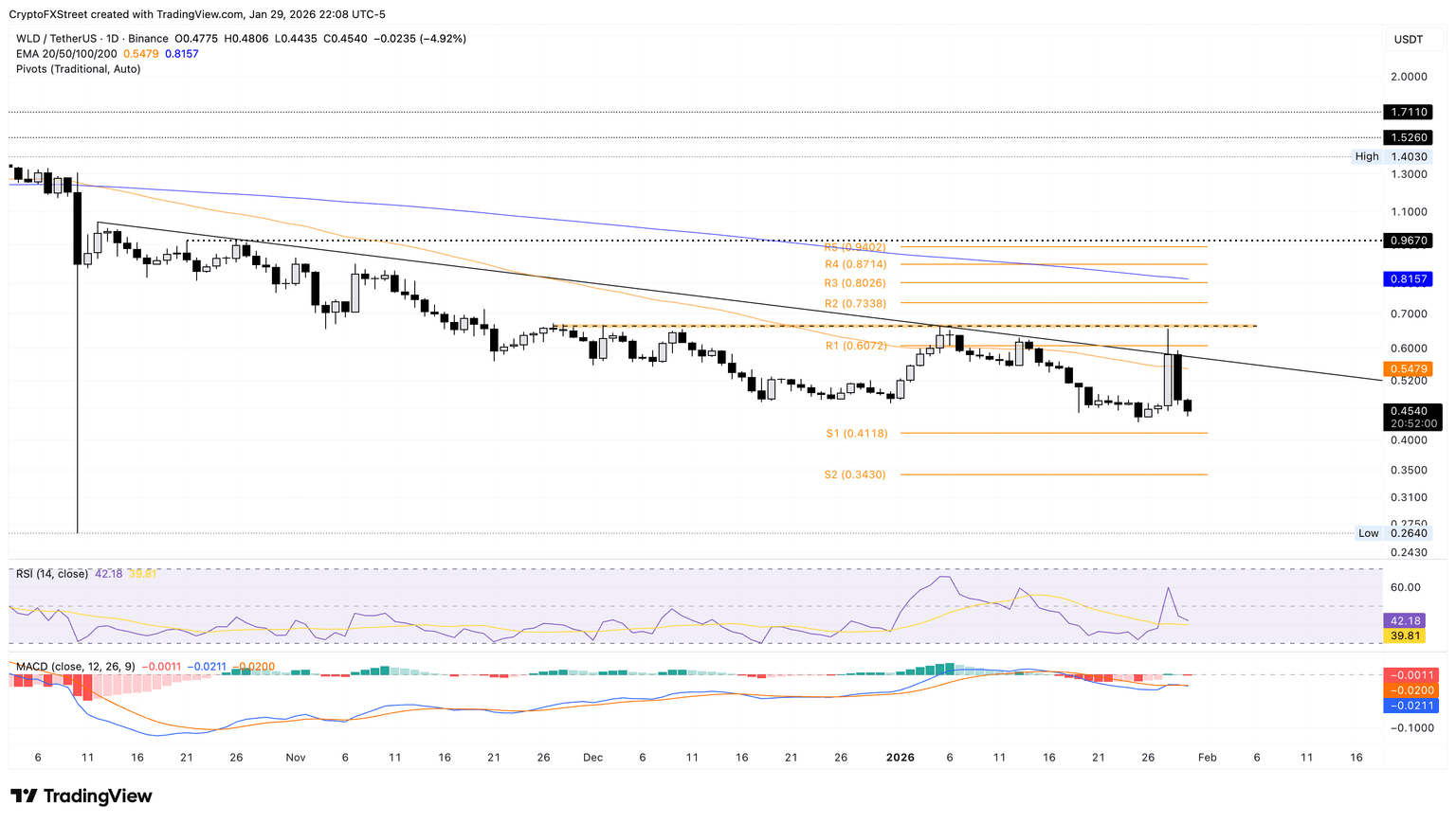WLD 的直接支撑位在 S1 枢轴点 0.4118 美元,其次是更深的支撑区域 S2 枢轴点 0.3430 美元。