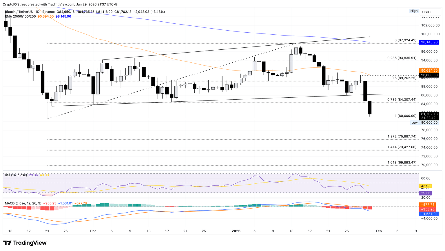 如果比特币跌破 80,600 美元,则可能进一步下跌至 75,887 美元的 1.272 斐波那契扩展位,该扩展位是从 11 月 21 日的低点 80,600 美元到 1 月 14 日的高点 97,924 美元计算得出的。