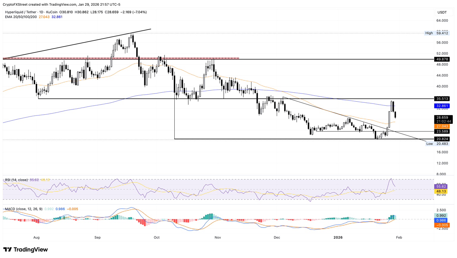 如果 HYPE 当日收盘价低于 50 日均线 27.04 美元,则可能重新测试 12 月 21 日低点 23.58 美元的水平。