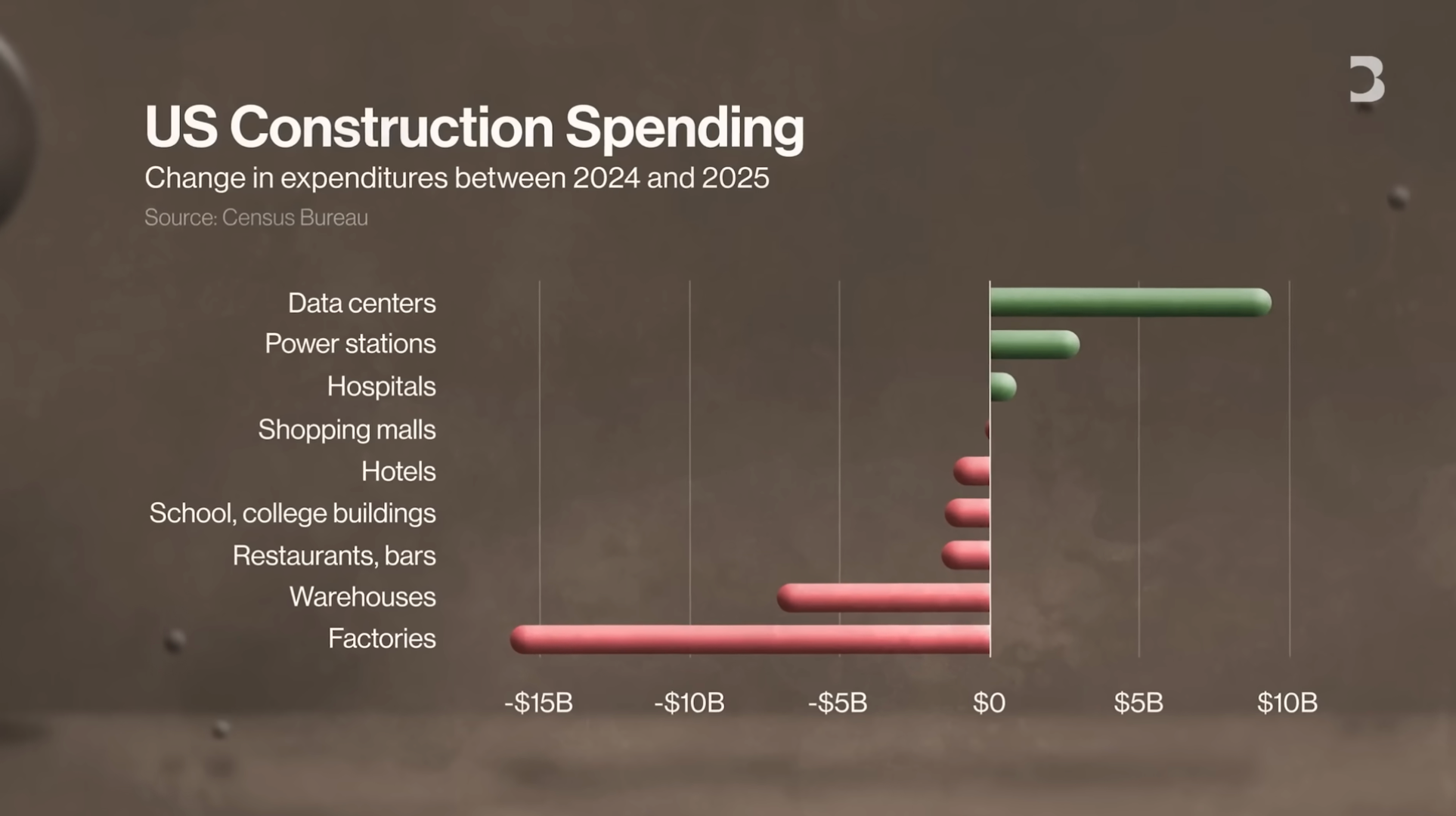与此同时,大量投资正在涌入数据中心的建设,推动了全国范围内的基础设施扩张。我们正经历一场基础设施建设的“军备竞赛”。比如,2025 年的建筑支出在大多数行业都呈下降趋势,但数据中心和发电站的支出却在增加。许多公司正在充当 AI 行业的“基础建设者”,积极投入到这些项目中。据摩根士丹利的最新估算,企业在 AI 数据中心上的总投资预计将达到 3 万亿美元。