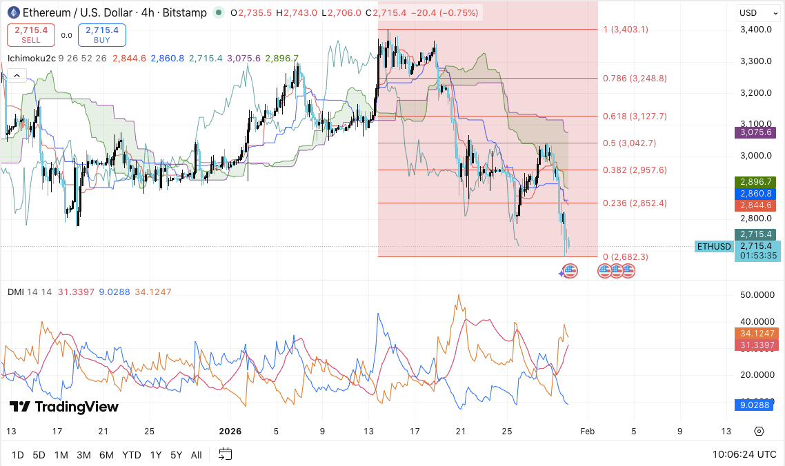 以太坊短期交易持续承压,技术指标、衍生品数据和现货交易流向均显示市场态度谨慎。在4小时图上,ETH/USD在跌破关键斐波那契支撑位后,结构性疲软。除了图表信号外,以太坊管理层近期披露的信息也为市场增添了新的关注点。